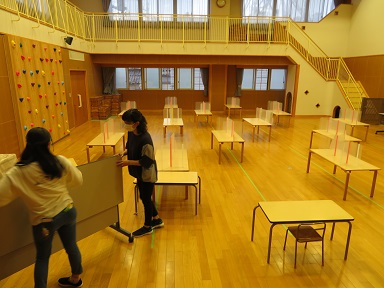 子どもたちが着替えをしている間に、先生たちは遊戯室で朝食が出来るように準備をしています。