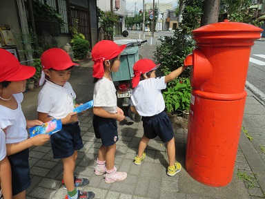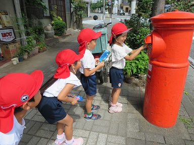 15日、年長さんは伝馬町の郵便ポストへハガキを投函しに行きました。敬老の日にちなんでつくった絵手紙を出すためです。