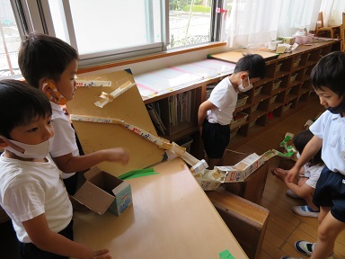 うめぐみさんはお山のすべり台で拾ったドングリを使ってコロコロと転がるコースを実習生と一緒に作りました。ドングリがコースから飛び出てしまったりコースの途中に詰まってしまったりしていましたが、どうしたらうまく転がるかな?と考えていました。