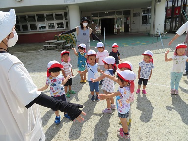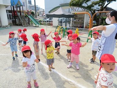2歳児のお友だちもお庭で一緒に朝体操を始めました。先生を見ながら体を動かします。はとぽっぽ体操はこいのぼり運動会からやっている大好きな体操です。
