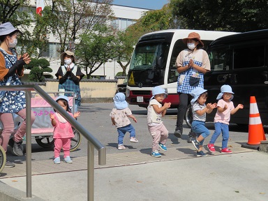 たんぽぽさん(1歳児)も庭で体操をするお兄さんお姉さんを見ながら体操をしていました。皆で体操するって楽しいな。