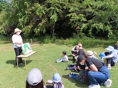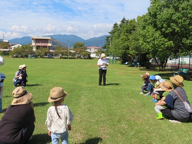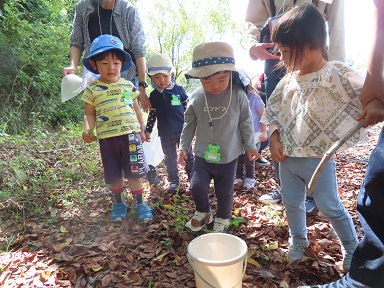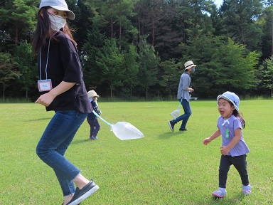 その後は袋を持ってお散歩へ。色々な大きさや色のキノコを見つけたり、ニセアカシアの葉っぱを笛にしたり(音の出せたお母さんは少なかったけれど)、クヌギのどんぐり、松ぼっくりを集めたり・・・。おまけにトンボ、コオロギ、バッタ、チョウチョウ、トカゲ、トノサマガエルなどなど、小さい生き物にも出会いました。お散歩から帰ってくる頃には、お顔も腕も赤くなっていましたが、初秋の自然を肌で感じることができたようです。
