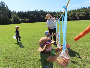 折角屋外に来たので、今まで自粛してきたおやつもいただきました。今年も運動会の旗拾いは行わないため、代わりのおやつ取り競争をしましたよ!お母さんから離れて取りに行き、お母さんのところへ戻るということをよく分かってやる気満々でできましたね!
