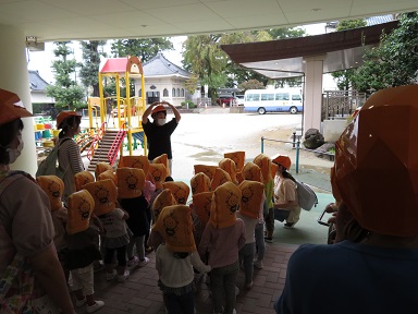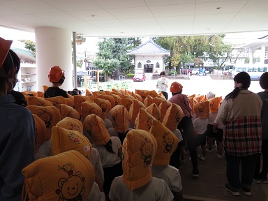 未満児は北玄関ポーチで髙松副園長先生から訓練の様子についてお話をして頂きました。