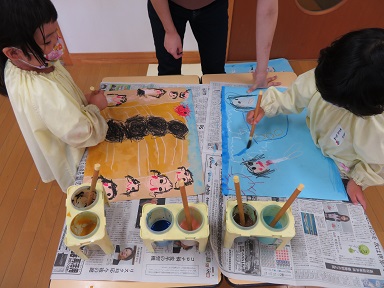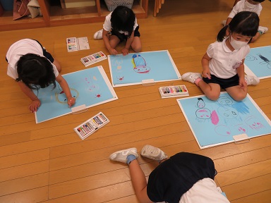 大きな紙に向かって描いている年少さん。「こんなことしたね」「楽しかったな」という声が聞こえてきそうです。