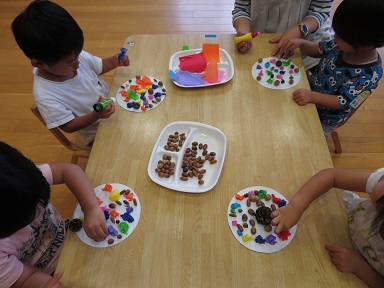 きく組さんは折り紙でどんぐりを折っています。お友だちと教え合う姿も見られました。壁面に飾ります。