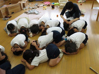 地震の放送を聞き、揺れが収まるまで「だんごむしのポーズ」で身を守ります。