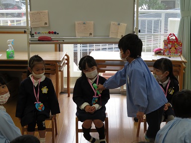 ペンダントをかけてもらって嬉しそうなお友だち。どんなペンダントかな?と思わず見てしまいます。