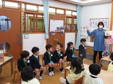 誕生会後は、各クラスで誕生者にインタビューをしたり、プレゼントのカードを見せてもらったりします。