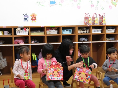 園長先生にペンダントをかけて頂いたり先生から誕生日バックのプレゼントをもらっています。