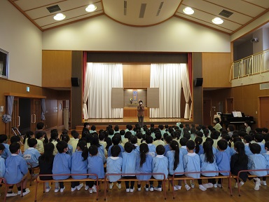 遊戯室に久しぶりに皆で集まって誕生会ができました。園長先生からお話をして頂いています。
