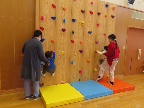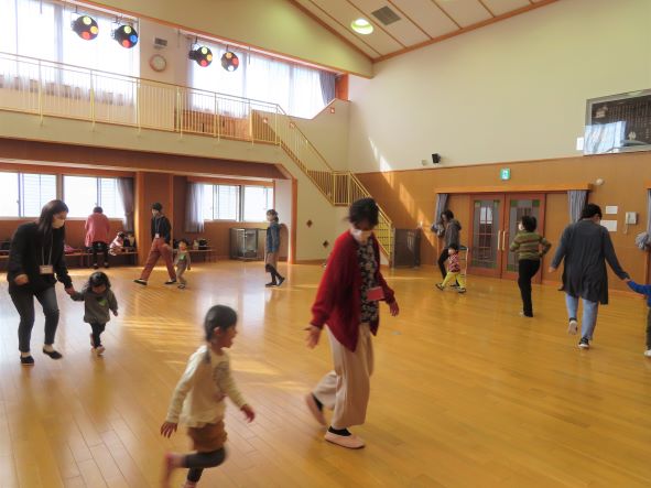 親子で手を繋いで行う運動や、体操、紅白玉やジョイントマットを使った遊びを8組の親子が楽しみました。やっぱり、お母さんと触れあって遊ぶのが一番幸せそうです。