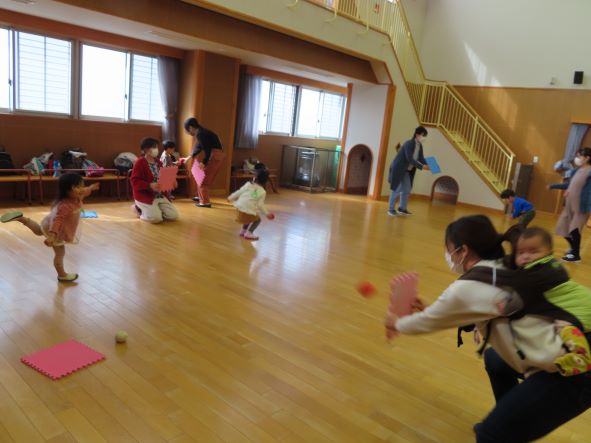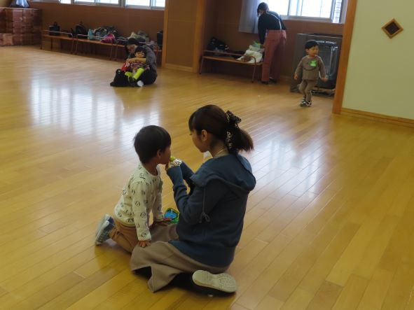 紅白玉とマットを使った遊びでは、子どもがお母さんの持っているマットめがけて玉を投げることをしてみました。体全体を使ってコントロール良く投げて、お母さんにマットで打ち返してもらうと面白く感じたようで、キャッキャキャッキャ声を出しながら嬉しそうに繰り返し行っていました。めっきり寒くなってきましたが、親子で体を動かして体がぽかぽか温まりましたね。