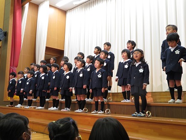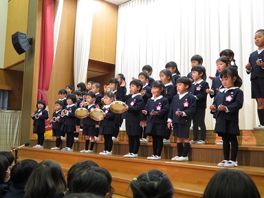 普段保育室でクラスのお友だちと楽しんでいる手遊び歌を学年皆でステージに立って見せてくれました。