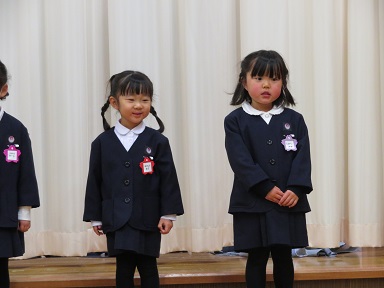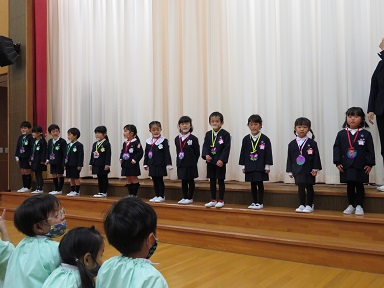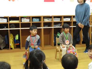 未満児さんの誕生者は2歳児の2名でした。髙松先生からペンダントをかけて頂き、クラスの先生から誕生日のカードを見せてもらいます。