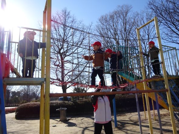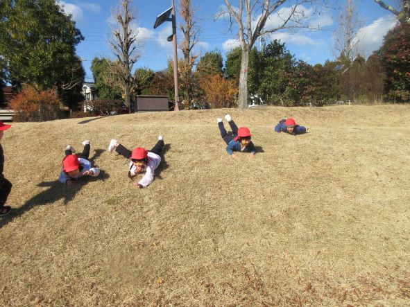 公園内の遊具で遊んだり、芝生の坂を転げ回ったり、お友達や先生とたくさん遊んできました。