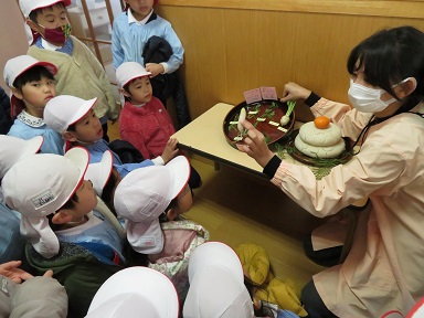 後ろに映っている鏡餅を見せて下さいながら、鏡餅は何を映すのかな?と聞くと、子どもたちから「心!」と返ってきました。