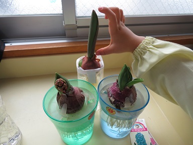 立春を過ぎて、暦の上では季節は春。各クラスで水栽培しているヒヤシンスの花が見えてきました。うっすらと花の色も分かってきました。