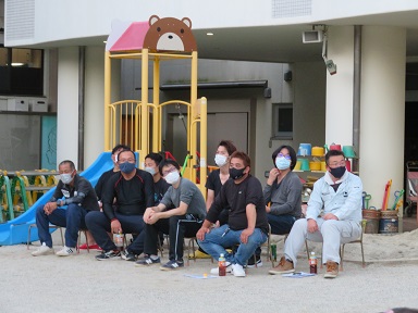 会場の片付けをしてからは、職員とお父さん方で反省会をしました。お父さん方のおかげでスムーズに進行できました。