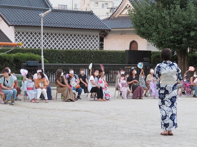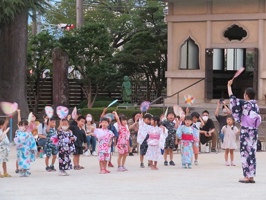 まずは、うちわをつかって「ほたる」を踊りました。自分で作ったうちわ、きれいですね。