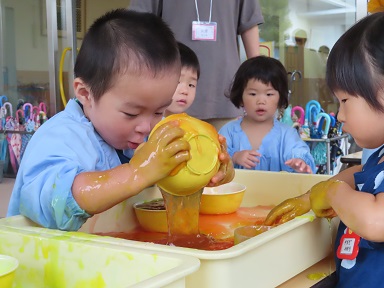 違う色同士を混ぜると、全く別の色になることの面白さを感じられたり、ペットボトルにコップを使って注ぎ込む時には、集中して手の操作をするなど、お子さんには良い刺激があります。それに、色々なジュースに見立ててお家の方と一緒にジュース屋さんをするのもいいですね!ただし、美味しそうだからと言って、間違えて飲まないように気をつけましょう。
