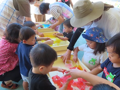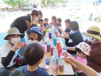 色水はバケツやボールなどに絵の具や食紅を溶いて色々な色水をつくり、透明なコップやペットボトルに注ぎ込んでミックスジュースを作って楽しみます。用意する色は、赤・黄色・青・白を使うと、美味しそうなジュースができますよ!